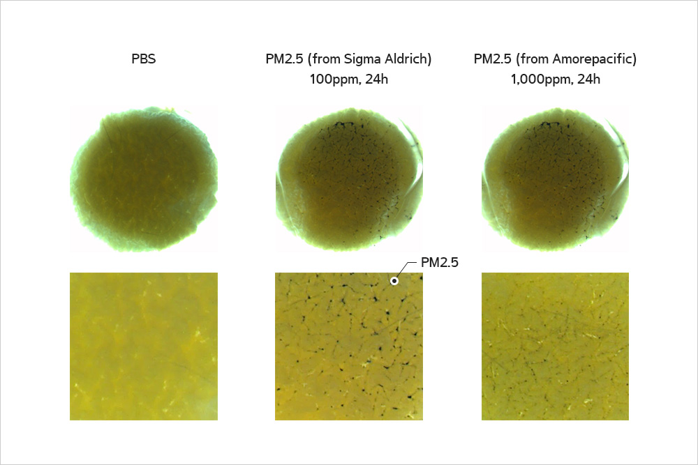 아모레퍼시픽 R&I 센터는 미세먼지의 피부부착을 방지/완화해주는 방어 측면으로도 여러 연구를 시도해왔습니다. 다양한 크기의 파우더가 피부 위 촘촘히 배치되어 균일하고 매끈하게 피부표면을 커버해주는 미세굴곡형태의 화장막을 형성해주는 기술이 대표적입니다. 피부친화성 입자를 이용하여 방어막을 형성하는 폴리머를 피부에 고정시키는 기술도 미세먼지의 피부부착방지를 돕습니다.