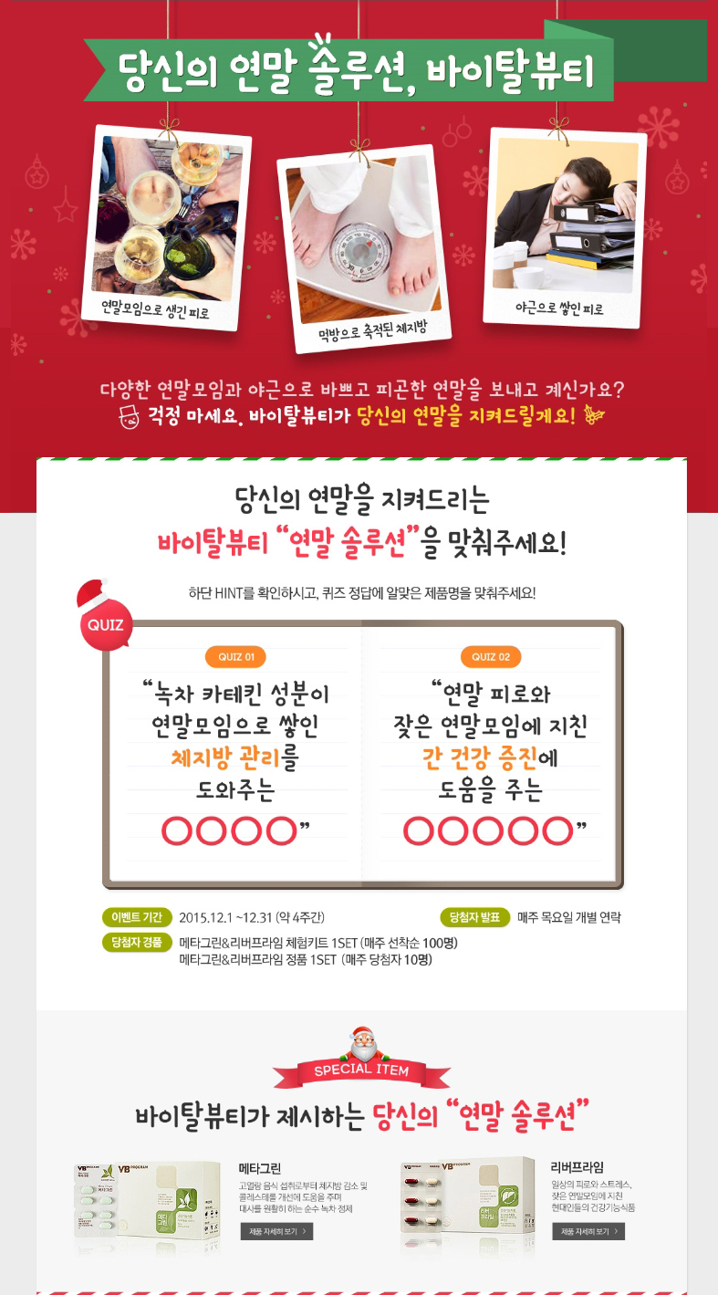 아모레퍼시픽의 이너뷰티 솔루션을 제공하는 브랜드 바이탈뷰티는 오는 12월 31일까지 잦은 연말 모임으로 지친 직장인들을 위한 ‘연말 솔루션’ 이벤트를 진행한다.