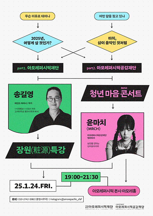 아모레퍼시픽재단과 아모레퍼시픽공감재단이 '제2회 장원(粧源) 특강 X 청년 마음 콘서트'를 1월 24일 19시 아모레퍼시픽 본사에서 개최한다.