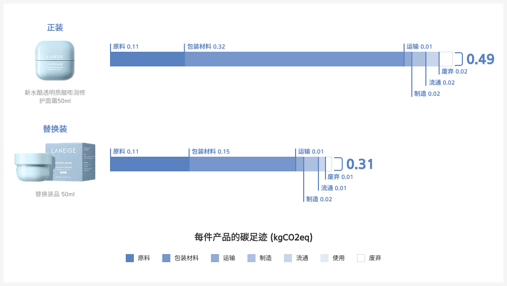 随着包装材料重量的减轻,替换装产品的碳足迹较正装产品减少37%