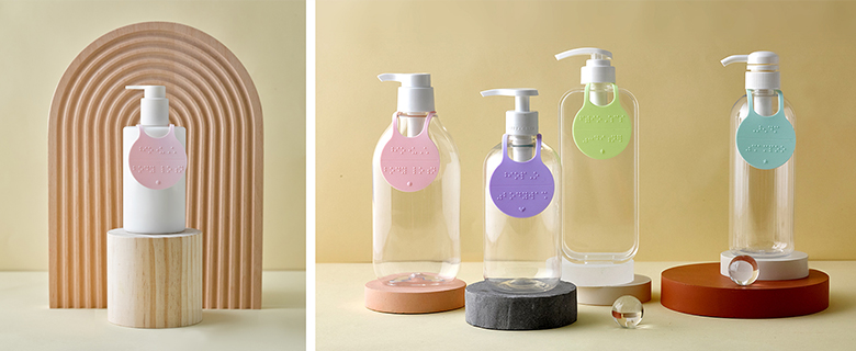 该产品由硅胶材质盲文标签四款、明信片两款和盲文一览表组成。标签上分别标有代表沐浴露、身体乳、洗发水和护发素的韩语和英语盲文。标签下方有不同图形的浮雕标识,便于区分产品。该标签可吊挂在不同尺寸的卫浴用品,可用性极佳。