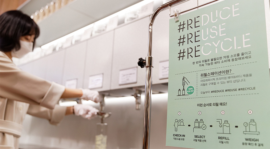 該当店舗にはエコの価値を盛り込んだ▲「REFILL STATION」もあり、ここではHAPPY BATH、mise en scèneブランドのシャンプーとボディウォッシュなど10種の製品を中身だけ小分けし販売する。リサイクルプラスチック(PCR PET)で作った詰め替え専用透明容器は店舗で再利用できるので環境にやさしく、中身も合理的な価格で購入することができる。該当店舗は化粧品空瓶の粉砕品を活用したインテリア素材を床仕上げ材として活用し、店舗の入り口に植物を植え環境にやさしい要素を加えた。